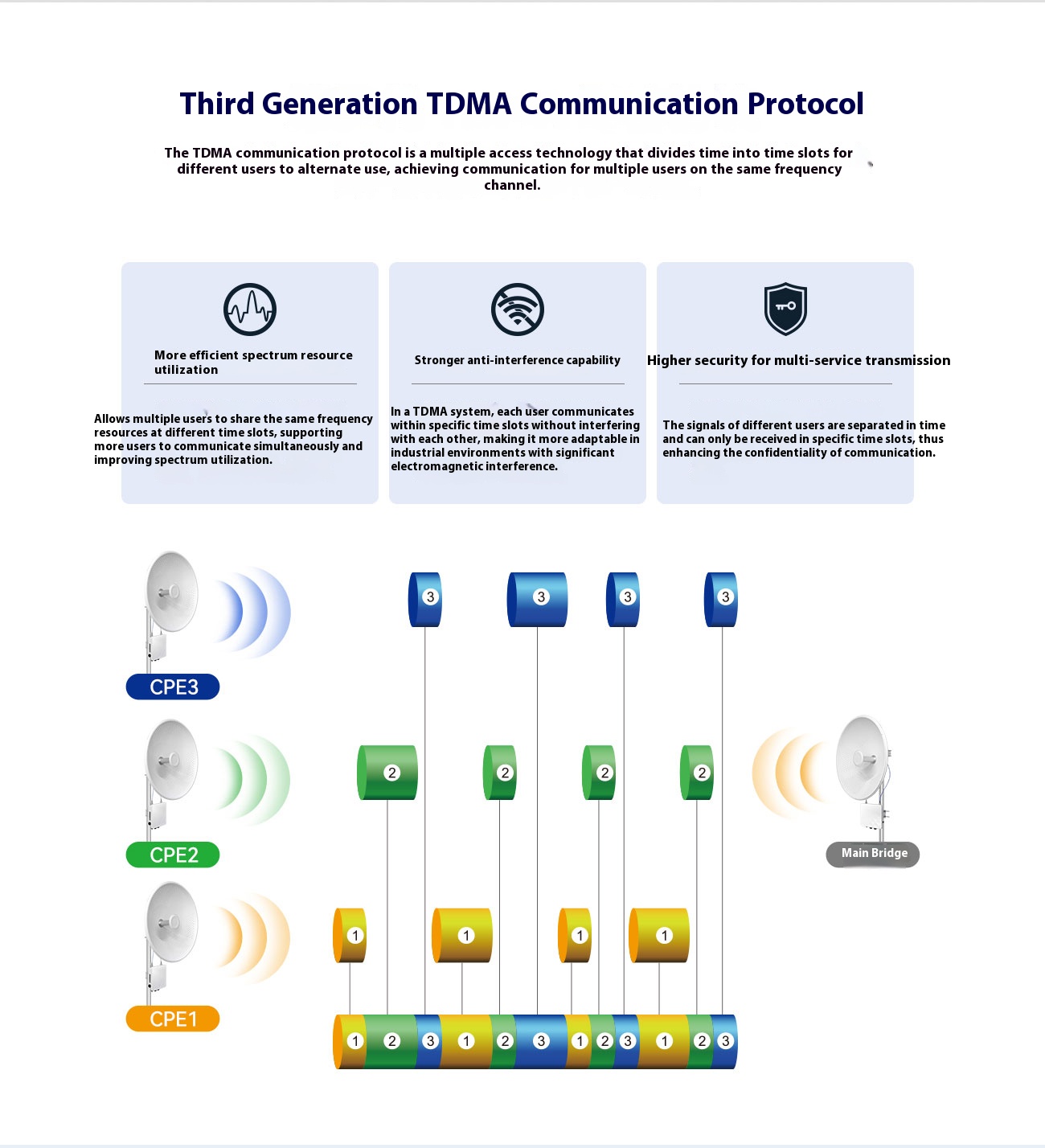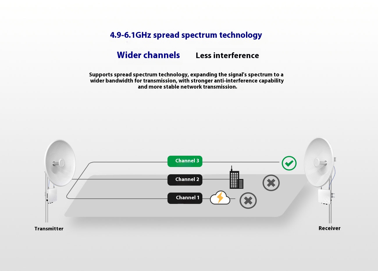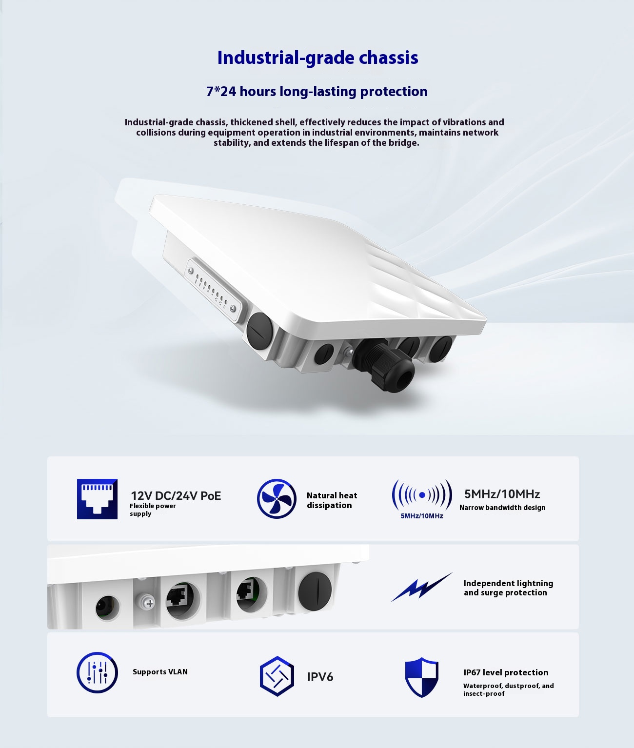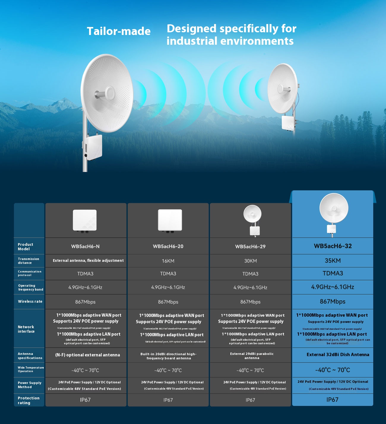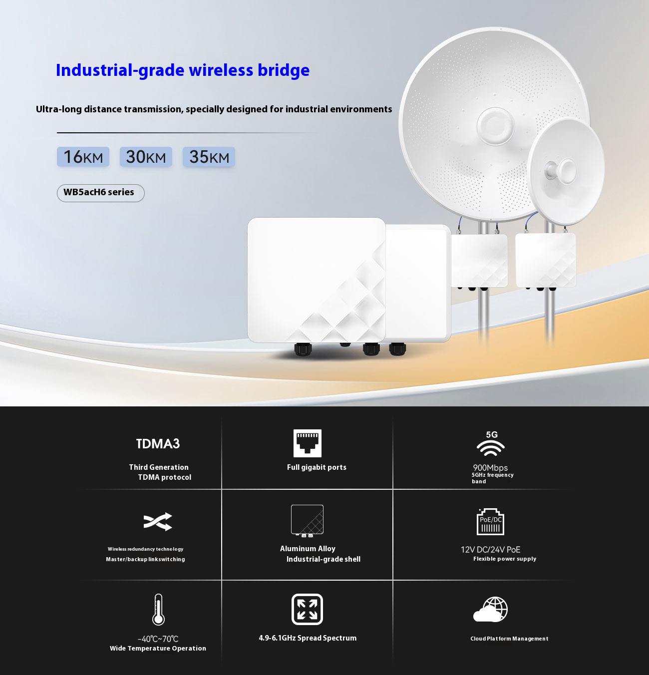 | Wireless | Intelligent dynamic polling, automatic channel selection, automatic modulation mode selection, automatic transmission power control (ATPC) |