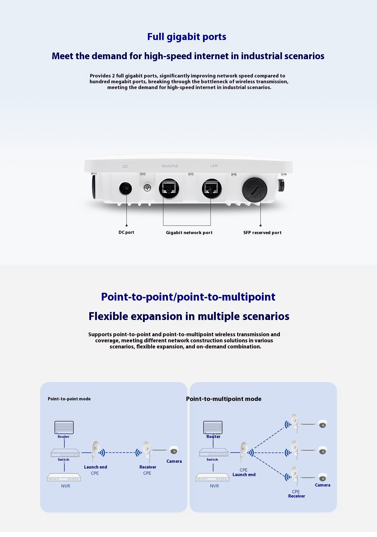 | WAN | 1*10/100/1000M WAN, support 24~48V Passive POE | ||||